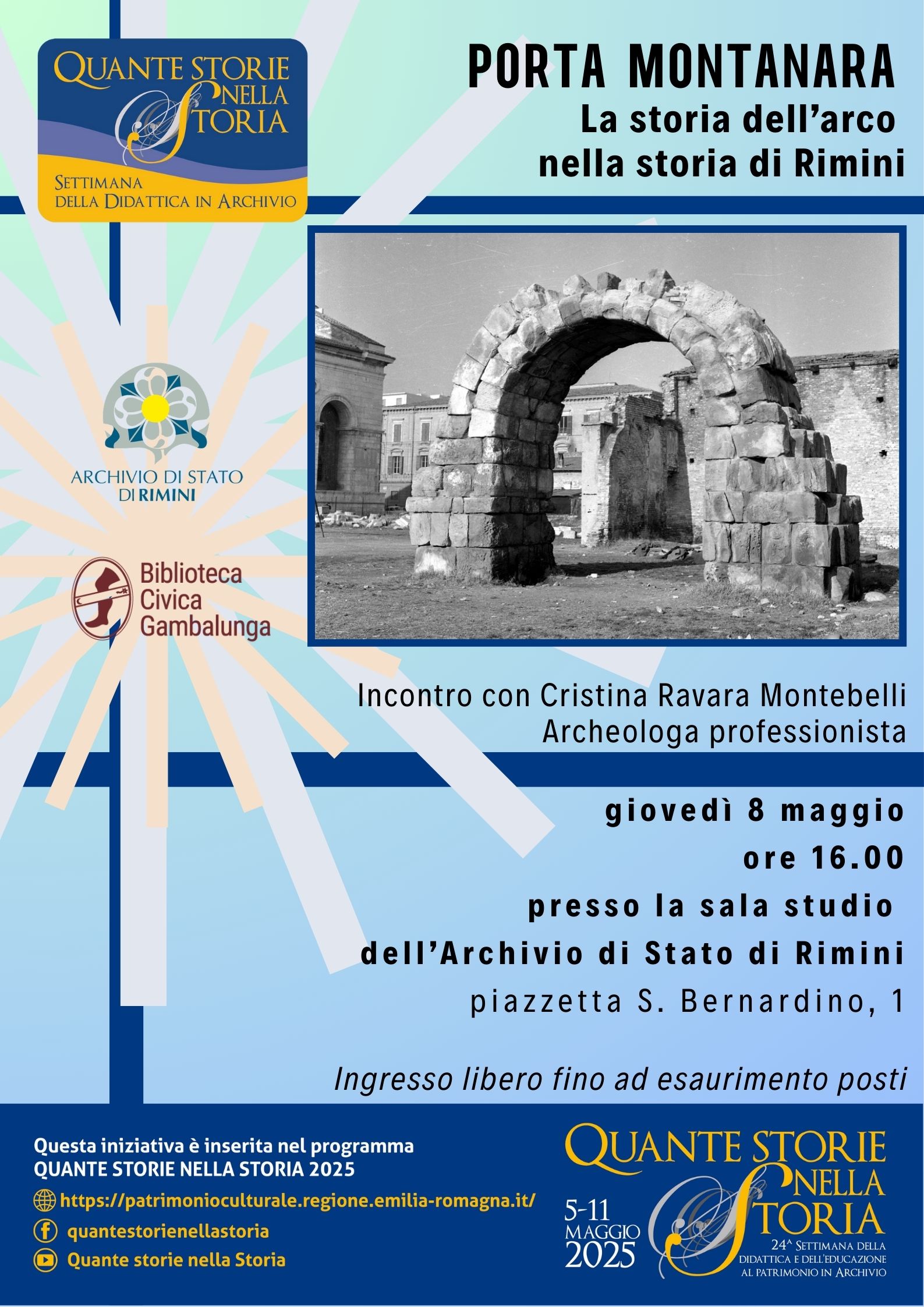 "Porta Montanara: la storia dell'arco nella storia di Rimini" Incontro con l'archeologa Cristina Ravara Montebelli nell'ambito della manifestazione "Quante storie nella storia 2025" organizzata dalla regione Emilia Romagna.